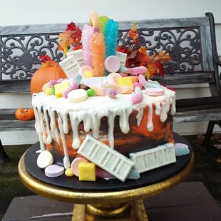 a wedding cake on a bench