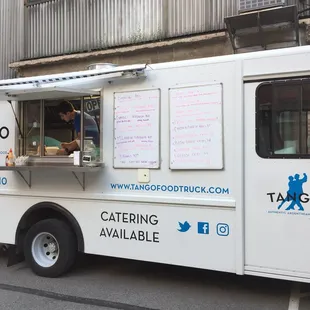 Tango has Authentic Argentinian food. The menu includes Steak Sandwich, Milanesa, empanadas Beef Kabob, Chorizo & salad. Had the Choripan sausage sandwich with chimichurri, onions and peppers. It came with a side of rice. Great sandwich. Check them out on Facebook: https://www.facebook.com/tangofoodtruck/