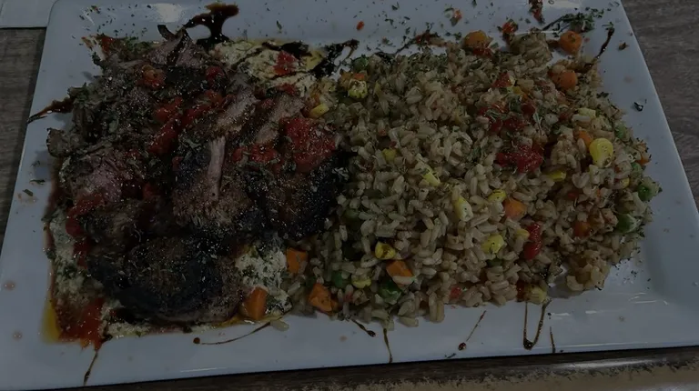 General Tao's Steak with fried rice and steamed vegetables.