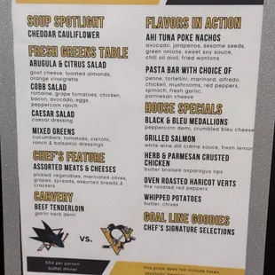 A must try experience when going to a Penguin's game. Buffet style with different stations. One of my favorite was the dessert station.