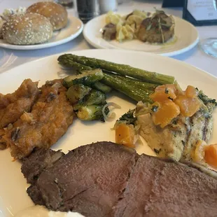 Beef petites, pork loin, potato salad, chicken, and broccoli