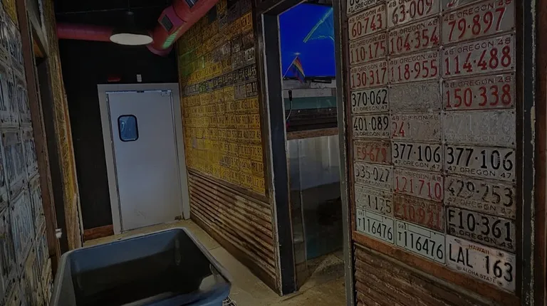 8/29/2024 - The hallway to the restroom is covered in Hawaii and Oregon license plates.