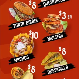 $4.99Flour tortilla stuffed with cheese, birria, onions and cilantro.