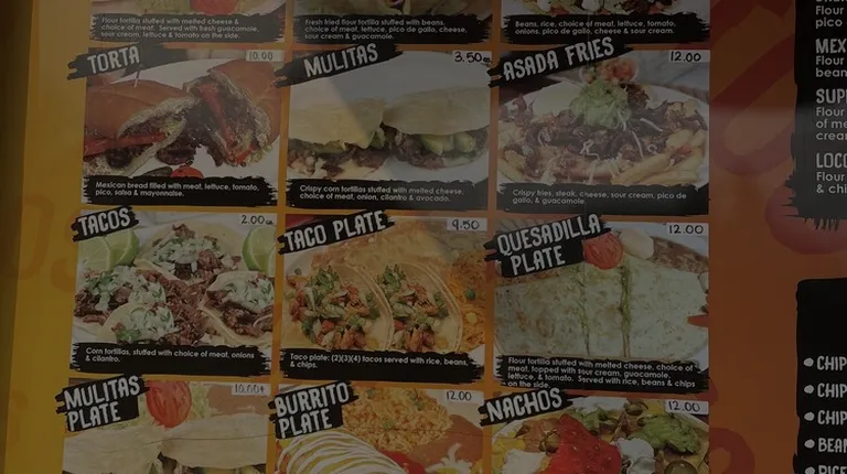 $12.993 mulitas stuffed with cheese and meat onions and cilantro and avocado. Served with rice and beans.