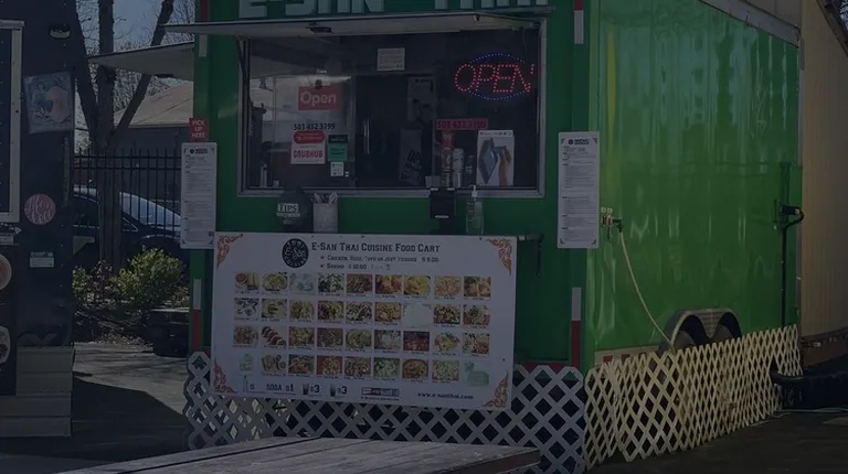 Inside the workings of E-San Thai food cart near Alder. it's small, but they still crank out great Thai food for cheap. Yes, they use woks!