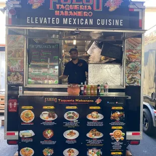 Tinga burrito, elote, tacos with tinga, pastor, fried crab, and fried fish