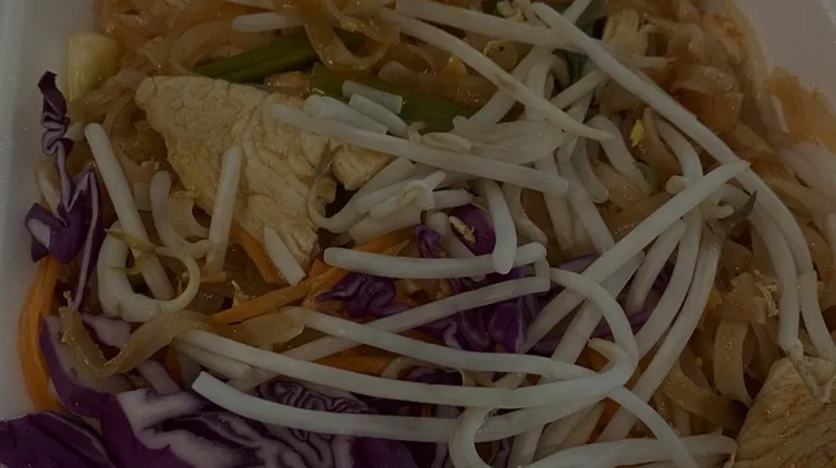 Pad Thai Stir-fried Thai rice noodle with pork, egg, ground peanuts, bean sprouts, green onions and carrots.