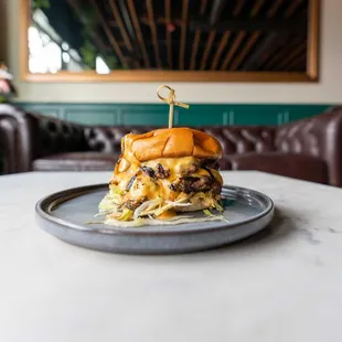 a burger on a plate with a toothpick sticking out of it
