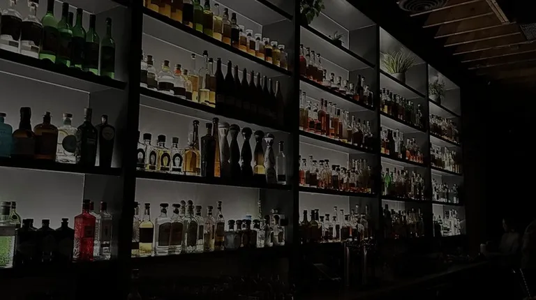 a dimly lit bar with a lot of bottles on the shelves