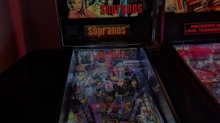 a pinball machine in a dimly lit room