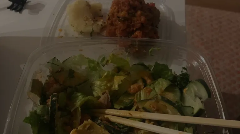 rice, cucumbers, and vegetables in a styrofoam container