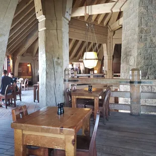 Brought friends from the east coast to Timberline, a hotel on the National Historical Register and filled with so much history and architectural detail. We had already hiked around Trillium Lake and worked up an appetite so stopped at Rams Head Bar on the 2nd floor for the views and some food. Service was slow, they are definitely understaffed as of this writing. At least when our drinks came it made the long wait for the food more bearable. The stars of the orders were the opened face albacore tuna sandwich topped with peppers. It was flavorful and very filling. As was the Caprese sandwich served on ciabatta. My friend who ordered the elk sausage said it was fantastic. Unfortunately me and another friend ordered the Italian sandwich and it was barely edible. Served on a thick baguette that was stale and dry, I couldn't get it down. Just a few slices of meat, tomato, and two pieces of spinach it was far from satisfying. But I was hungry! So I ordered a side salad which was a bowl of fresh spinach and one single olive with oil and vinegar bottles brought to the table. I discarded the top of baguette, added lots of spinach drizzled with oil & vinegar to add needed moisture and flavor, and did my best to get some of it down. For $22, it was dismal.All the sandwiches were served with a huge portion of kettle chips, so many that we combined the leftovers into a takeout box for car snacks.Beers and hard cider come in 10, 16 or 22 oz sizes and were all good. Our waitress warmed up to us eventually, we even managed to make her smile and chuckle. Never understand why places that can charge a premium because they have a fabulous view get lazy with the food. In my world, you can have a spectacular view and delicious food.