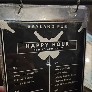 We had not been to Skyland Pub for quite a few years....so many restaurants and pubs to choose from!Madi K our waitress was welcoming, friendly and accommodating. We ordered a chicken quesadilla and a pork quesadilla. She mentioned that the kitchen staff would halve each one...yay!The quesadillas were very good! Large serving with a side of salsa and sour cream. Happy hour is 3-6 pm so these were $8 each. We will definitely keep Skyland Pub on our radar! Enjoy!
