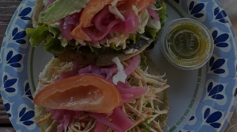 Standard panuchos. Chicken, refried beans, pickled onions, lettuce, and tomato. Habenero lime sauce too