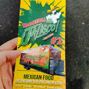 a taqueria jalisco express truck parked next to a picnic table with an
