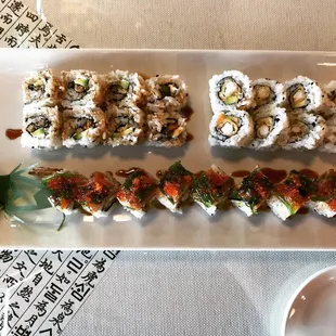 Real crab California, yellowtail and tuna, Hawaiian roll