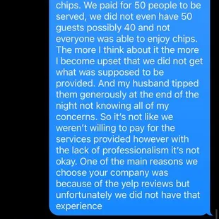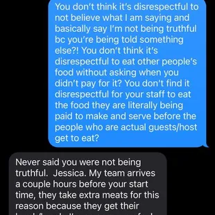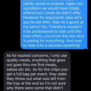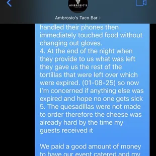 BEWARE BEFORE BOOKING! If I could give ZERO stars I would! The other reviews must be from friends because what is described is NOT what we received! We hired this unprofessional company 3 weeks in advance to cater my son's birthday this past weekend (1/25/25).Communication from Erica started out well, prompt and professional. However, the day of our event she sent out two younger guys, they arrived on time, set up and were prompt to serve at the time our contract said even 15 mins earlier (therefore they left 15 mins earlier than originally scheduled but still "served" for 2 hours) Now this is where things went downhill. 1. The Ambrosio's staff was eating the food we paid for, which wouldn't have been a problem however they ate BEFORE all of my guests were served and done eating. 2. They ate food from our other vendors without our consent or us offering. Now again I have no issues with offering it however the fact they took it upon themselves to do so was in my opinion very unprofessional 3. I saw multiple times they handled their phones then immediately touched food without changing out gloves. 4. At the end of the night when they provide to us what was left they gave us the rest of the tortillas that were left over which were expired. (01-08-25) so now I'm concerned if anything else was expired and hope no one gets sick please see the photo of the tortillas in pictures 5. The quesadillas were not made to order therefore the cheese was already hard by the time my guests received it6. The price we paid for services ($850 not to mention the generous tip my husband gave not knowing all this happened) included chips and salsa and more than half my guests didn't get chips! Of course because of these concerns I reached out to Erica, and well I will allow the messages to speak to what kind of company you will have to deal with if you choose to go with them but I encourage you to find another company I would have paid another company more to have a better quality service.