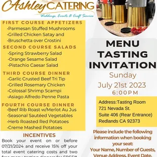 I called 8 different caterers in search of a caterer who could do a plated dinner (with servers) for a fundraiser banquet for our nonprofit. All but one, didn't have the staff to do it. One caterer suggested that I use them and enlist my own volunteers to serve. Then I found Ashley Catering. Not only did they have the staff to do a plated dinner for 150 guests, they had an awesome dinner selection! We gave our guests the option to have either Garlic-crusted Tri-tip, Rosemary Chicken, or Ricotta stuffed Manicotti. All of the food choices were excellent. Everyone was pleased and highly praised the food and professional service - no complaints! My wife and I were so busy hosting that we didn't get to eat at the event. Philip, the coordinator, saw this and made us to-go plates with a sample of all three meal options! We ate as soon as we got home and the food, even later, was outstanding! They also provided, and set up, all of the table linens. The decor was outstanding and the table settings were on point. I couldn't have asked for better service or for a better outcome... the catering really made our event stand out. I highly recommend Ashley Catering for your catering needs!