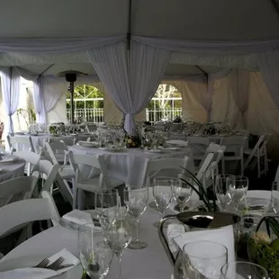 Transform any venue to a more romantic intimate venue. Market lights, chiffon swag, black chairs, our dishes, glasses and linens.
