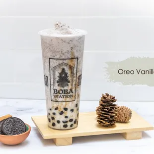 a glass of boba milk tea and a pine cone