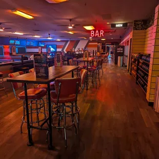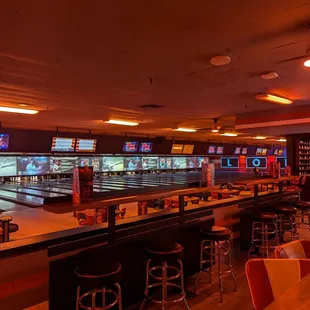 Inside. Bar is located at the left of all the lanes.
