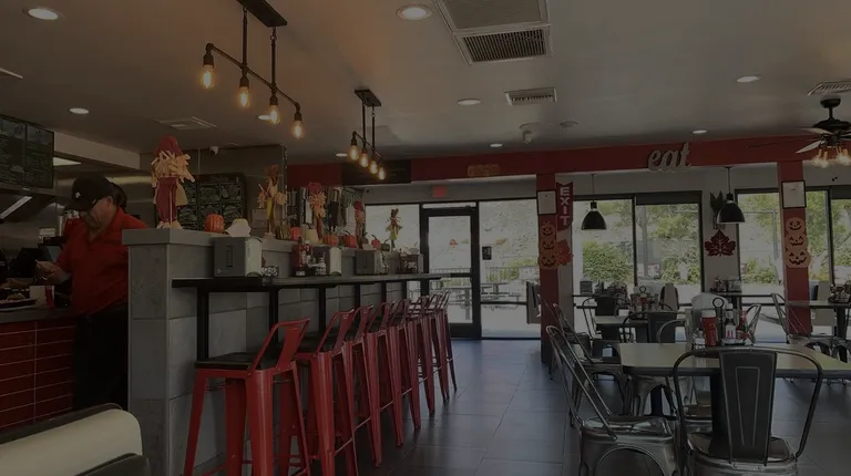 a restaurant with a counter and stools