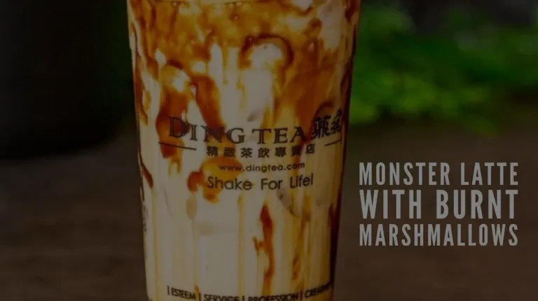 Monster latte with Burnt Marshmallows. Made with whole milk a little brown sugar drizzle and comes with golden boba