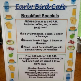 Early Bird Breakfast specials. Subject to change.