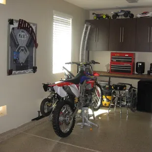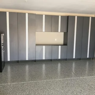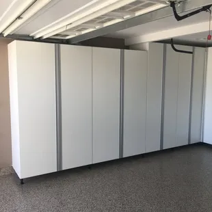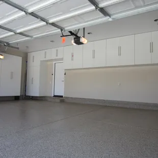 Factory 1 full garage makeover, epoxy flooring, drywall repair, paint, can lighting, cabinets, slat walls, garage door openers.