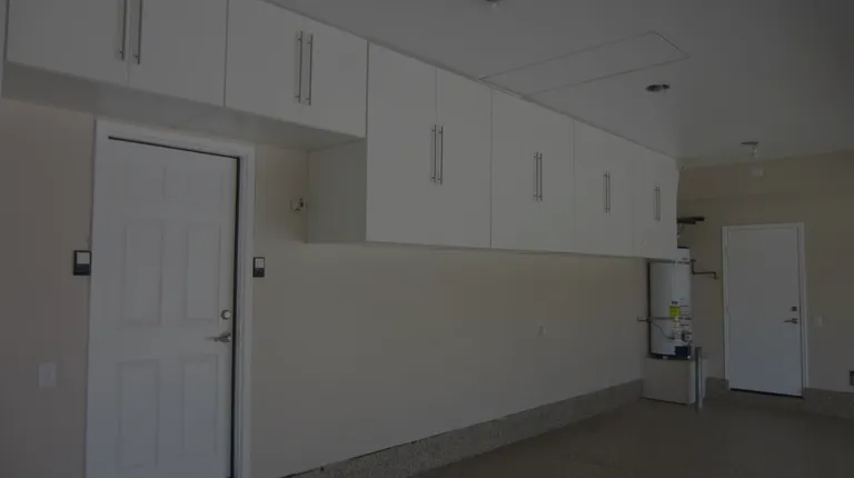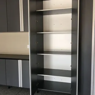 Slat walls and custom garage cabinets. Many color options and sizes available. Overhead, base, and pantry style.