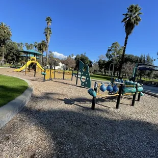 One playground at this large park out of 2. We go to this park almost every weekend. There are homeless but I've never felt unsafe. I love this playground for my kid, 2 different areas, swings, stepping stones, and a music area. The only downside is there is usually trash everywhere. The park has volunteers daily to pick up the trash and there are a million trash cans. We love seeing the ducks in the lake.