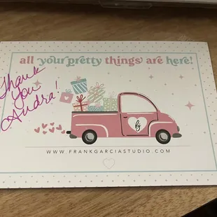 I had the good luck to find Frank Garcia Studio through a Facebook purchase. Upon reading the company's stellar Yelp reviews, I find myself rather jealous that I am not local and cannot visit the shop. It sounds amazing. I was compelled to write a review because I was so impressed with the service I received when purchasing. My order of gorgeous scrapbooking paper arrived within a couple of days and was wrapped in pink tissue paper with a cute sticker to tie it all together. On the top of the order was an adorable little card thanking me for the order, and the person who packed the order even personalized the "thank you" with my name. I appreciate them really going above and beyond when it came to packing my order. Thank you!