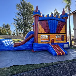 Blue and Red castle available for your next party. Call or text 909-702-9797 to reserve.
