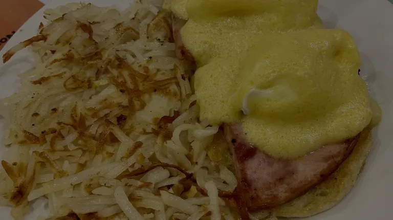 The food is great. Eggs Benedict or Florentine por moi, and eggs over easy, with sausage, crispy hash potatoes and toast for my husband. He's easy to please. The menu is all American accept for the eggs Benedict. Coffee is great, and the tea is English. They didn't serve Chai Tea last time I was there, so you may wish to stop by Starbucks on 6th St. before you go there... if you like Chai tea.