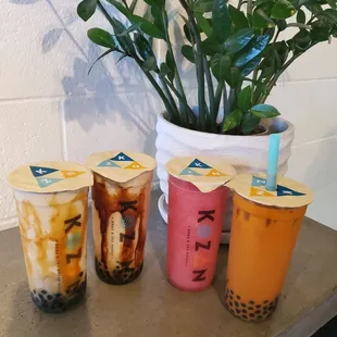 Spooky Thai, Taro Wave, Strawberry Matcha, Classic Milk Tea