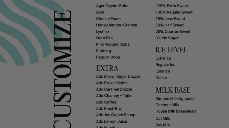 I love this place SO MUCHHH!! Their boba is my favorite, particularly their Mango Wave! They have the best fruit drinks, especially their slushes! The employees are always the nicest people and they are so easy to talk to!! The lot it's located in is near my school so I walk over after whenever I am craving a sweet, boba drink!! They allow you to change the sweetness level as well which is always great!! They have a variety of options and they are all SOOO GOOODDD! Give this place a try! PLEASEEE!