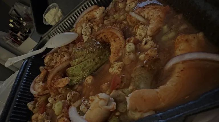 SCALLOPS, RAW SHRIMP, COOKED SHRIMP, Onions, Cucumbers, and avocado. ALL MARINATED IN LIME and the special homemade sauce!