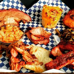 Slow smoked baby back ribs, chicken, jalapeno cheddar sausage.