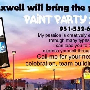 My husband contacted this company to do a wine and paint at our house for my birthday. I'm so glad he did!!!Max and his girlfriend was amazing!They brought the canvas, paints, brushes, cups for the water and plates for the paint.All you need to provide is tables, chairs and a water source. We chose a scene painting. We did a side by side swan/cherry blossom scene. Max did one side and his girlfriend did the other side. He went slow and did step-by-step. Max was so amazing and so patient! We had a mixture of girls (ages 7-10) and adults mommies. Max was so good with the younger girls! I would highly recommend him for any of your paint parties!
