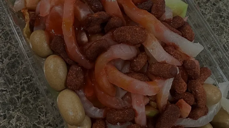 The first time I had Tostilocos was at the border of California and Baja Mexico about 20 years ago. This definitely brought back some memories of my youth lol. My tostilocos was packed with cucumbers, jicamas, pickled pork skins, Japanese peanuts, tamarind candy and Tostitos at the bottom. Chamoy sauce is poured on top with lime. I like adding cholula or tapatio sauce to mine to make it a little spicy.