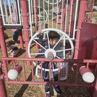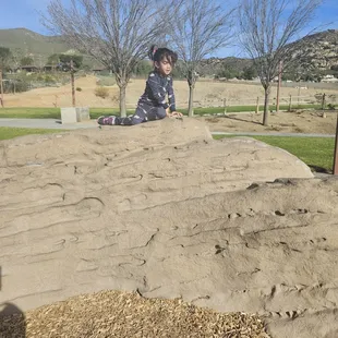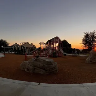 Great park for kids & toddlers to burn off their energies & they need more fun time outside rather than playing video games/ on their phones.That is awesome that hey even had rock climbing areas for kids too at this park.There are some things that need improvement at this park.It would be great if there was shade/ trees covering the post structures because it does get hot here.They need baby changing stations in the bathrooms.Change out the wood chips into rubber / safer materials for the kids. There were so many kids that got wood splinters from the roof chips in this playground. -1They should have an area where dogs can run around; this would be nice too.