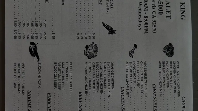 Amazing both Chinese and pizza food. Service is outstanding giving the locations there at. The atmosphere is located in downtown perris soooo... that it self can give you an idea of the unwell taken environment,but the restaurant itself does there best to keep the inside and outside looking tidy and professional for there customers. They are closed Tuesday - Wednesday and opened 11am-8pm.
