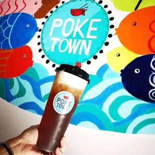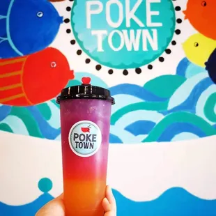 a hand holding a cup of poke town