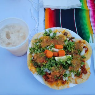Queso tacos, 3 al pastor & 3 asada and a homemade horchata!