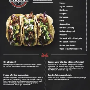A friend hired them for an event and they were amazing! They did a really good job at product presentation and making sure all items were set up neatly and intentionally organized. The quality of the meat was outstanding! I'm very pick with taco quality and they did a really good job. Will be recommending them and hiring them in the future!