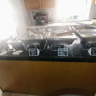 Chicken enchiladas and chile colorado, refried beans, borracho beans, Spanish rice, and poblano rice. Salsa and guacamole were included also