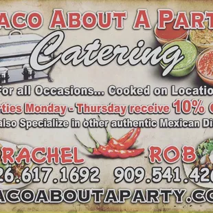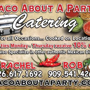I must say they have the best tacos, and service, I just hired them to cater our year end school picnic and I was very impressed. They came with everything that they we're going to need, I didn't need to do anything but make sure they had space to set up and hungry people to feed, these guys are very professional, and I would definitely use them again. I recommend them awesome service Thanks Michelle, Rachel, and Rob you guys are awesome