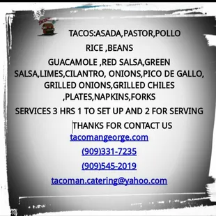 Taco Man George is great! We had them cater to our company lunch and everything turned-out perfect!Food was delicious, staff is friendly and fast. We all enjoyed George's breakfast burritos. Mmm Mmm!George is a professional caterer who serves a lot of different Mexican food.A few of the foods are: asada, pollo, carnitas, buche, chorizo, cabeza, lengua and pastor.facebook.com/taco.man.969Thanks George, we'll be using your services again soon!