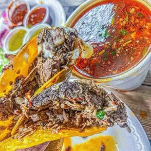 I'm giving you guys a 4 1/2 stars. This is for just my dish. Although, I also ordered chicken, chorizo , pastor, quesobirria tacos. I ordered birria combo with no bone. All the sauces at the salsa bar good but wished the purple onion and habanero wash pickled. I will be back because I really like the real goat birria when made well