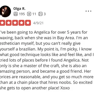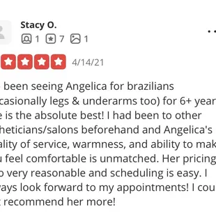 I've been seeing Angelica for brazilians (occasionally legs & underarms too) for 6+ years. She is the absolute best! I had been to other estheticians/salons beforehand and Angelica's quality of service, warmness, and ability to make you feel comfortable is unmatched. Her pricing is also very reasonable and scheduling is easy. I always look forward to my appointments! I could not recommend her more!
